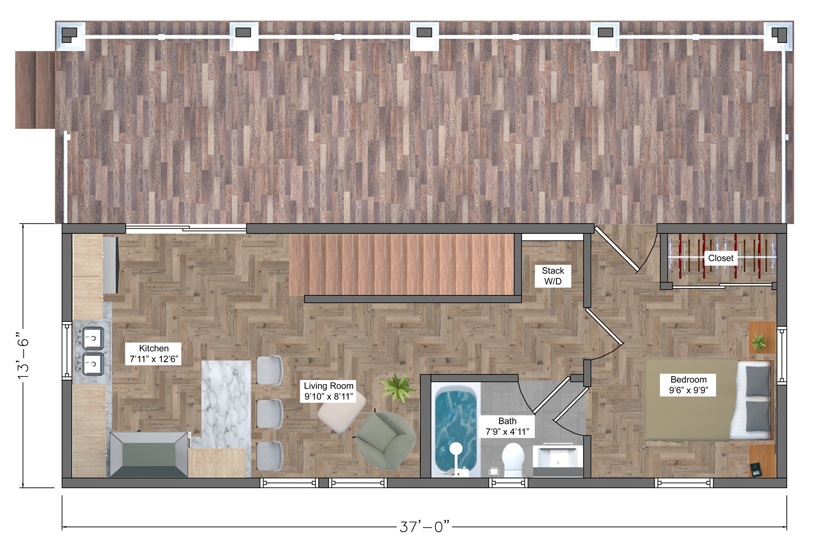 Main Living Areas (First Floor): Great Room: 12’6” x 14’7” – bright, central gathering space
