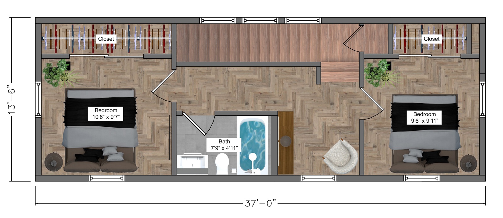 Upper Floor: Two bedrooms measuring approximately 10’8″ X 9’7″ and 9’6″ x 9’11” each with dedicated closet space